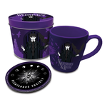 Aggiungi un tocco di stile Mercoledì Addams alla tua giornata con questo set regalo Wednesday (Nightshades & Ravens) (tazza e sottobicchiere in scatola di latta).