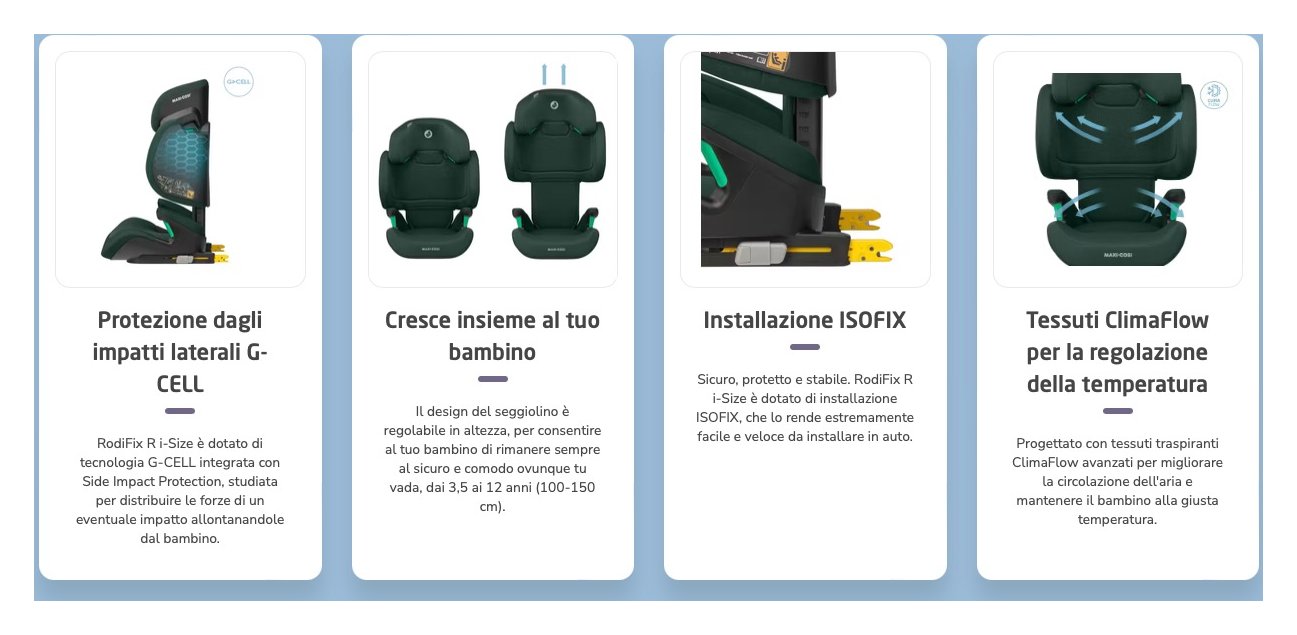 Costruito secondo i più elevati standard di sicurezza i-size, rodifix r i-size offre la massima sicurezza per il tuo bambino. Grazie all'installazione isofix, la stabilità è garantita anche quando il bambino non è seduto nel seggiolino. Il 45% degli impatti avviene lateralmente, per questo rodfix r i-size integra la protezione dagli impatti laterali g-cell, specificamente progettata per allontanare le forze dell'impatto dal tuo bambino e per ridurre le lesioni soprattutto intorno alla testa, al collo e alle spalle. Rodifix r i-size è regolabile per seguire la crescita del bambino, affinché sia sempre al sicuro in viaggio. Grazie al poggiatesta imbottito regolabile, allo schienale e alla morbida seduta, rodifix r i-size offre sempre la posizione perfetta per il tuo piccolo, dai 3,5 ai 12 anni. (da 15 a 36 kg)i genitori possono rilassarsi, sapendo che il poggiatesta e lo schienale estensibili non sono solo protettivi, ma forniscono anche un'ammortizzazione extra in ogni viaggio, che si tratti di una lunga avventura o di un rapido giro per negozi. Realizzato con tessuti riciclati al 100%, questo seggiolino auto con schienale offre sempre una posizione comoda, anche durante il sonno. Per un comfort superiore, rodifix r i-size è dotato di tessuti climaflow che aiutano a mantenere il bambino a una temperatura confortevole.