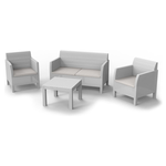 Il set da giardino Matilde da 4 posti è composto da 2 sedute con cuscini, un divano con 2 sedute con cuscini e 1 tavolo da giardino, perfetto per creare un'area relax all'aperto. Realizzato in Polipropilene resistente ai raggi UV, questo set è progettato per durare nel tempo. Le poltrone e il divano sono dotati di cuscini imbottiti per garantire il massimo comfort. Facile da montare e mantenere, il set è l'ideale per godersi momenti di relax all'aria aperta con stile