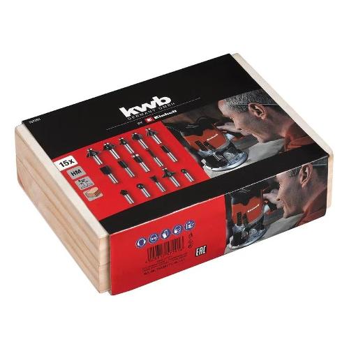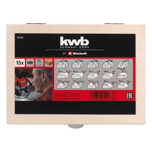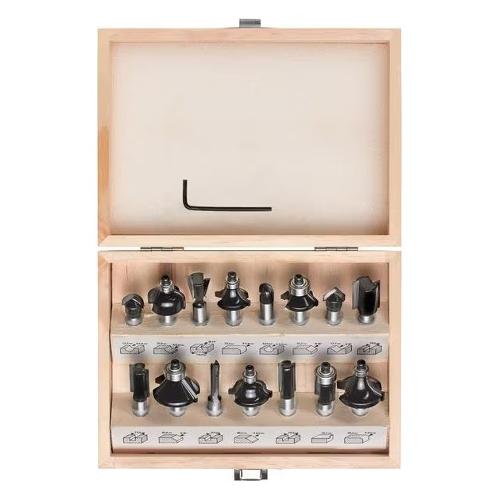 Frese in metallo duro dotate di gambo da 8 mm di diametro, frese per la profilatura di spigoli di legno come frese spuntatrici, frese per smussare, frese per quarti di cerchio, frese a semigola, frese per arrotondamento di spigoli e frese per profilare. Con cuscinetto di appoggio a sfera per una facile fresatura lungo gli spigoli di legno. Kit completo di frese per scanalature con diverse larghezze di scanalatura, frese per scanalature a v, frese a semigola e frese a coda di rondine per lavori su tavole di legno, in una cassetta in legno.