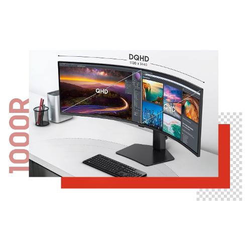 Aumenta la produttività immergendoti completamente nei tuoi progetti: il display da 49” con curvatura 1000R ti avvolge con un rapporto d’aspetto di 32:9 adattandosi perfettamente al tuo campo visivo. Con uno schermo Dual QHD così ampio, puoi osservare il quadro completo e produrre di più, senza rinunciare al comfort.