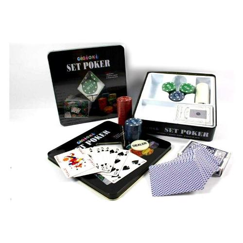 Scatola con 100 fiches, 1 bottone dealer, 2 mazzi carte poker