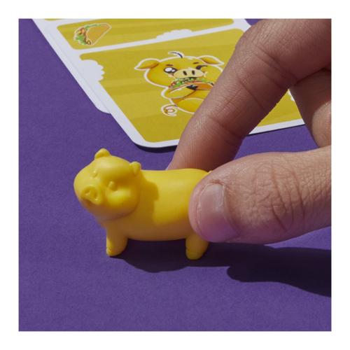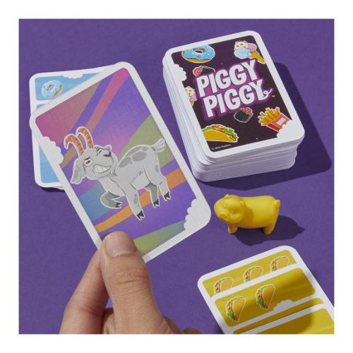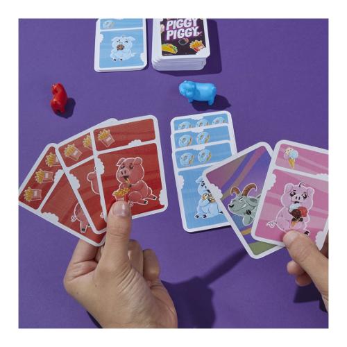 L'ingordigia vince! Il gioco piggy piggy è un frenetico gioco di carte per famiglie tanto facile quanto divertente! A turno, gioca le carte cibo dalla tua mano per cercare di rubare maialini e guadagnare più punti degli altri. Ogni giocatore inizia con 5 carte, comprese le carte cibo colorate, come i taco (giallo) e i gelati (rosa). Al proprio turno, un giocatore gioca tutte le carte che ha di un tipo di cibo, mettendole in una pila. Se la sua pila ha più cibo, il giocatore guadagna il maialino dello stesso colore o può rubarlo a qualcun altro! Hai una carta capra? Usala per sabotare un avversario scartando una carta cibo dalla sua pila e magari costringendolo a rinunciare al suo maialino! Quando un giocatore ripesca le carte alla fine del proprio turno, se ha dei maialini, segnerà un punto per ogni carta pescata che corrisponde al colore del proprio maialino. Totalizza per primo 8 punti per vincere! Il gioco piggy piggy è una scelta fantastica per chi cerca giochi di carte divertenti per bambini e adulti. Piggy piggy e tutti i personaggi correlati sono marchi commerciali di hasbro.
