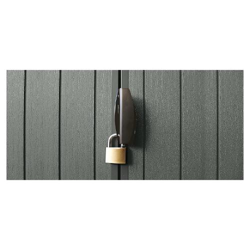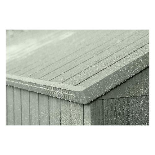 Casetta da giardino dotata di porta a due ante per l'accesso agli oggetti di più grandi dimensioni. Offre un'illuminazione naturale grazie alle due ampie finestre frontali e al lucernario in policarbonato. Struttura resistente composta da pannelli a doppia parete con intercapedine rinforzata e da struttura in metallo; il tetto resiste ai carichi neve fino a 75 kg/m²; resiste alle intemperie e ai raggi uv e non richiede alcuna manutenzione. ideale per per organizzare al meglio il tuo giardino e riporre oggetti di piccole e grandi dimensioni