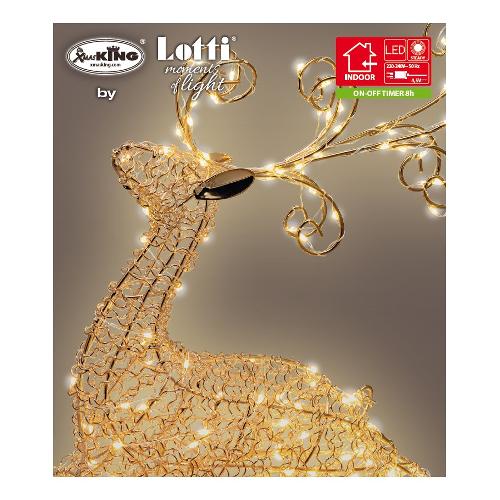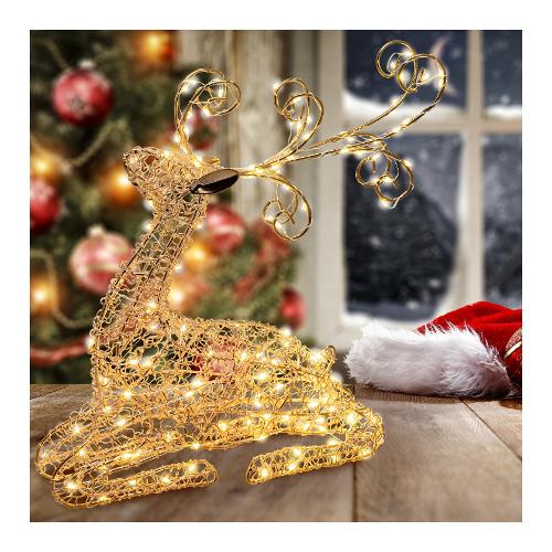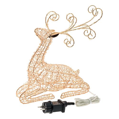 Renna sdraiata (kneeling) H30cm Filo Metallico color Rame Lucido, 80 MicroLED BIANCO CALDO ø1,5mm, Serie VPM Vacuum Plating Metal in metallo con finitura Lucida, adatta per appoggio, Luce Fissa, Timer On-Off 8-16 ore escludibile tramite pulsante luminoso, compatibile con Telecomando IR Multifunzione mod. XM-R1 (non incluso), Trasformatore Bassa Tensione di Sicurezza, IP20 uso Interno, Cavo di Alimentazione Trasparente 4m, Dimensioni 26x8xH30cm