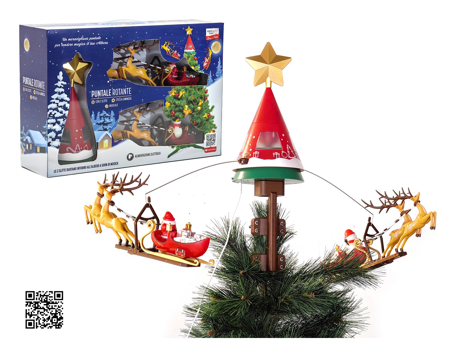 Un meraviglioso puntale per rendere magico il tuo albero di natale. Le 2 slitte ruotano attorno a suon di musica. Funzionamento 220v