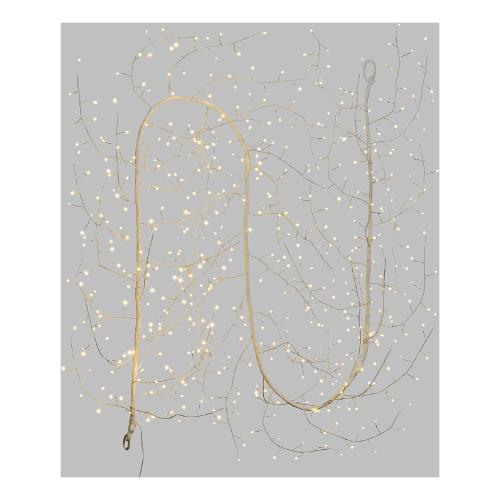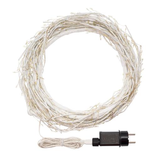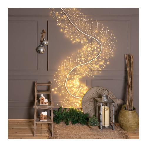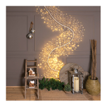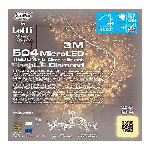 Ramo climber tiglio bianco 3m 56 rami 504 microled bianco caldo ø1,5mm, long leg led con gambo di 3cm, cavo metallo argento metal silver, gioco di luce automatico flashled diamond (448 led a luce fissa + 56 led flash con lampeggio veloce), anelli agli estremi per fissarlo o appenderlo, rami modellabili con anima in metallo, trasformatore selv di sicurezza, ip44 uso esterno e interno, cavo di alimentazione bianco 4m