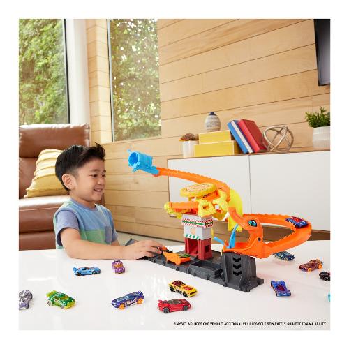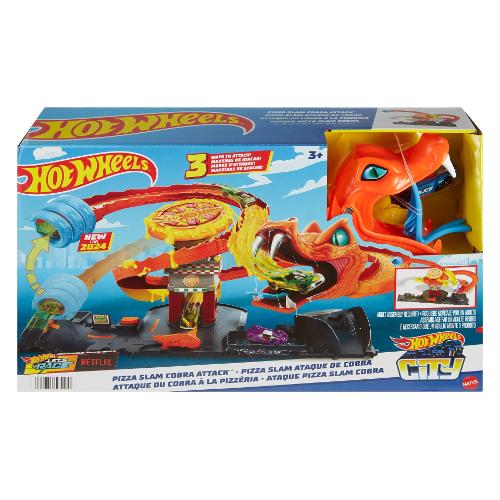 Sfida un cobra affamato che è strisciato in una pizzeria e salva hot wheels city proprio come nella serie netflix 'let's race'! Guida sulla coda del cobra e rilascia per vedere quale dei tre percorsi casuali seguirà la macchinina. Sfreccerà attraverso le fauci del cobra e finirà nel cassonetto? Forse la corsa non avrà fortuna e finirà nelle fauci della creatura. O forse lancerà una pizza in faccia al cobra, sconfiggendolo! Il set include fantastici dettagli di gioco per ispirare avventure narrative e può essere collegato ad altri set hot wheels city per infinite possibilità di gioco. Ognuno in vendita separatamente. Include un veicolo hot wheels. Colori e decorazioni possono variare.
