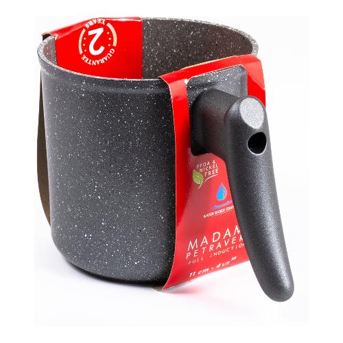 Il rivestimento in petravera pro conferisce ancora più robustezza e antiaderenza, realizzato con particelle minerali naturali garantisce di cucinare senza oli e grassi in modo sano ed equilibrato e di rimuovere il cibo senza sforzi. La superficie del manigliame in soft touch unita al particolare in metallo aumenta il grip della presa e conferisce un carattere unico e distintivo alla linea.