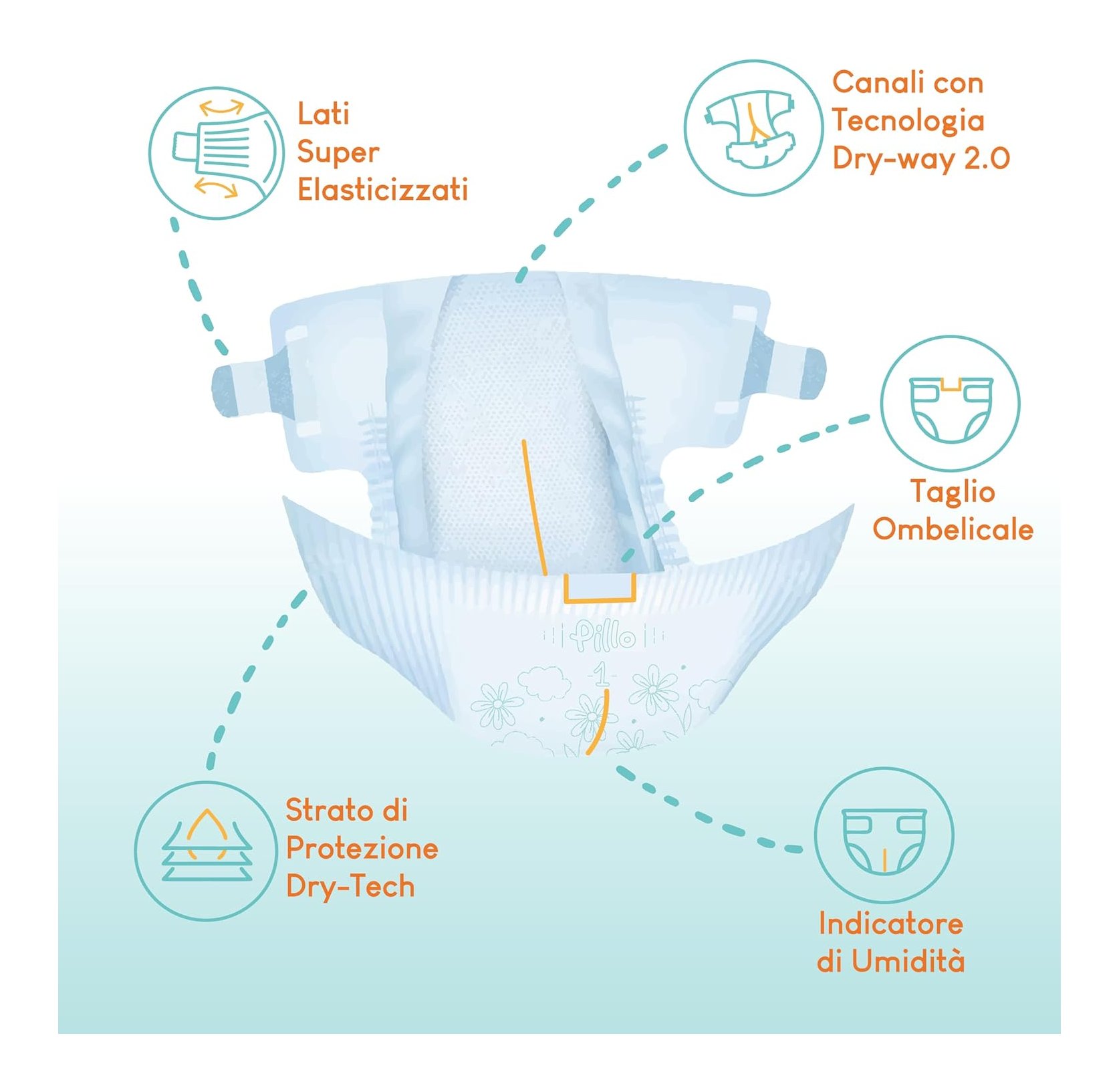 I pannolini pillo garantiscono al bambino il massimo comfort grazie al tessuto morbido e traspirante e ai fianchi superelastici. L'elevata assorbenza dei pannolini pillo è garantita dallo strato protettivo dry-tech, mentre la tecnologia dry-way 2.0 previene le perdite attraverso i condotti. La vestibilità regolabile e i fianchi superelastici garantiscono un perfetto adattamento al corpo del bambino. La certificazione oeko-tex standard 100 dei pannolini pillo garantisce la qualità dei materiali utilizzati nel processo produttivo, che viene svolto interamente in italia. L'impatto ambientale di pillo è costantemente ridotto. La certificazione i'm green pe attesta l'impegno di pillo nell'utilizzo di bioplastiche completamente compostabili nella produzione di pannolini per bambini. Inoltre la certificazione fsc attesta l'utilizzo di cellulosa proveniente da foreste gestite in modo sostenibile.