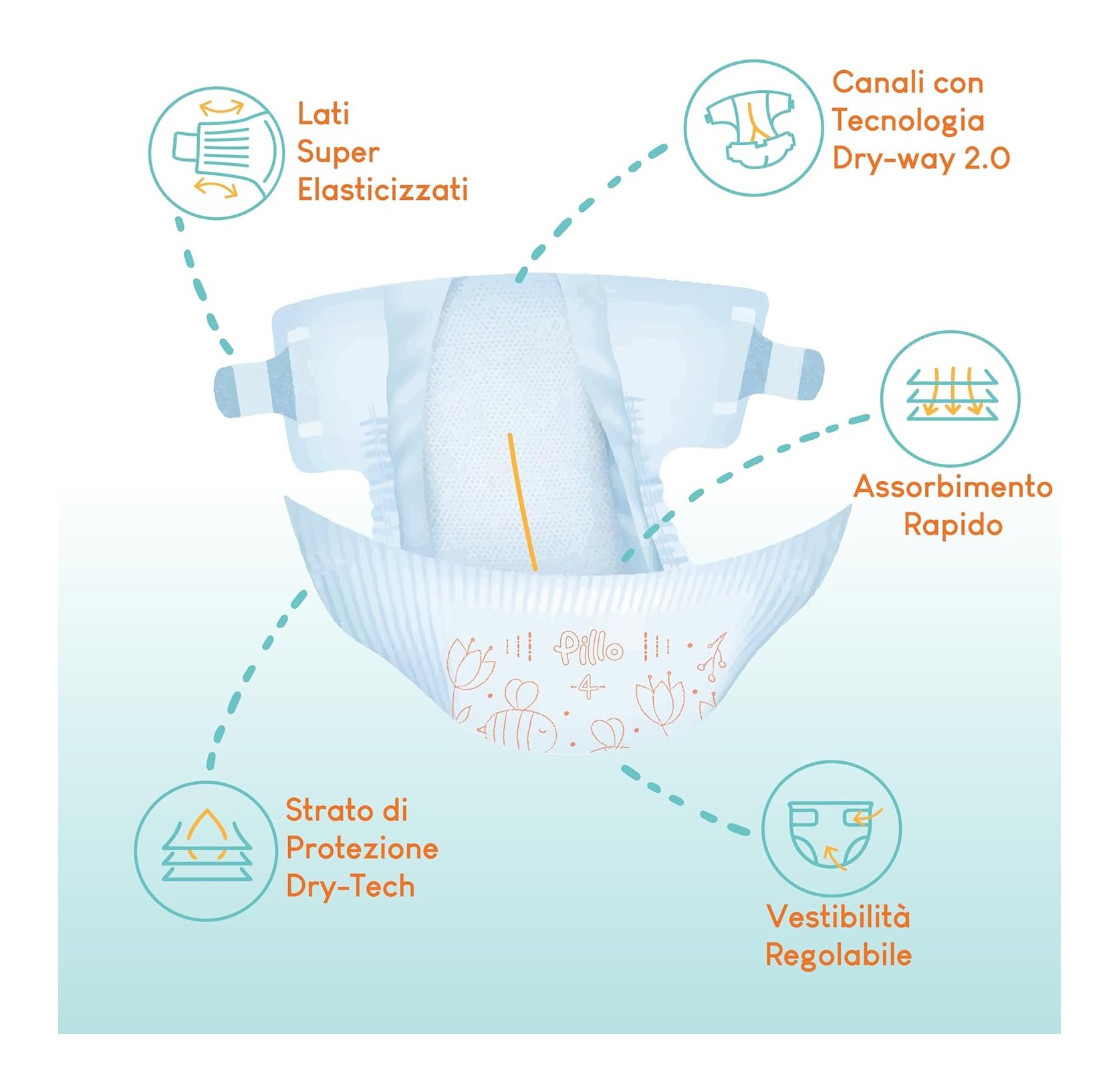 L'elevata assorbenza dei pannolini pillo è garantita dallo strato protettivo dry-tech, mentre la tecnologia dry-way 2.0 previene le perdite attraverso i condotti. La vestibilità regolabile e i fianchi superelastici garantiscono un perfetto adattamento al corpo del bambino.