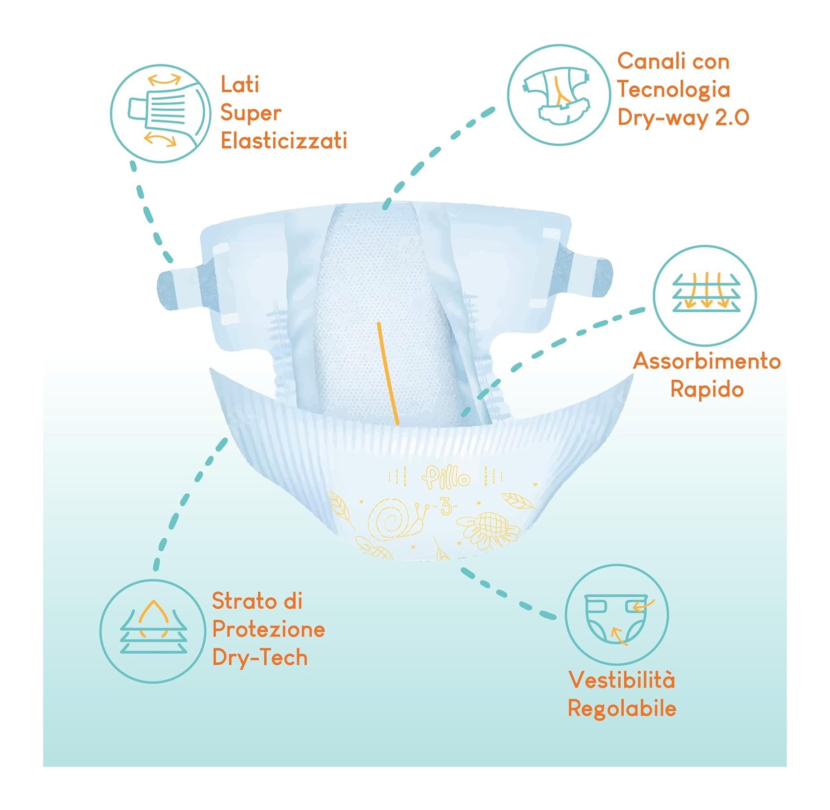 I pannolini pillo garantiscono al bambino il massimo comfort grazie al tessuto morbido e traspirante e ai fianchi superelastici. L'elevata assorbenza dei pannolini pillo è garantita dallo strato protettivo dry-tech, mentre la tecnologia dry-way 2.0 previene le perdite attraverso i condotti. La vestibilità regolabile e i fianchi superelastici garantiscono un perfetto adattamento al corpo del bambino. La certificazione oeko-tex standard 100 dei pannolini pillo garantisce la qualità dei materiali utilizzati nel processo produttivo, che viene svolto interamente in italia. L'impatto ambientale di pillo è costantemente ridotto. La certificazione i'm green pe attesta l'impegno di pillo nell'utilizzo di bioplastiche completamente compostabili nella produzione di pannolini per bambini. Inoltre la certificazione fsc attesta l'utilizzo di cellulosa proveniente da foreste gestite in modo sostenibile.