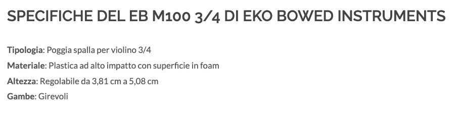 EB M100 3/4 è il poggia spalla per violino con misura 3/4 di Eko Bowed Instruments. È realizzato in plastica ad alto impatto con superficie in foam e regolabile in altezza da 3,81 cm a 5,08 cm tramite viti di regolazione. Le gambe sono girevoli per la regolazione della posizione.