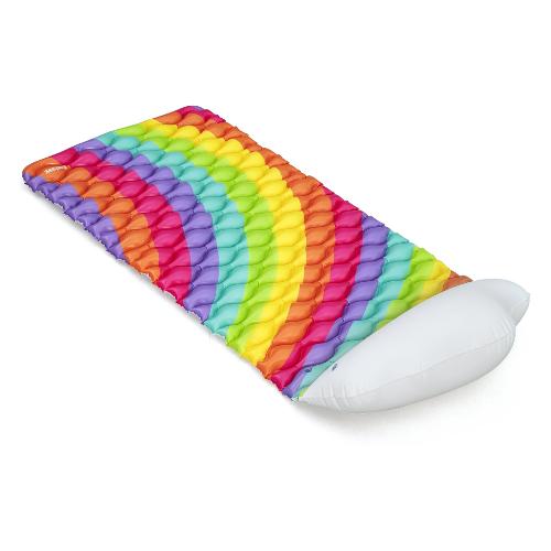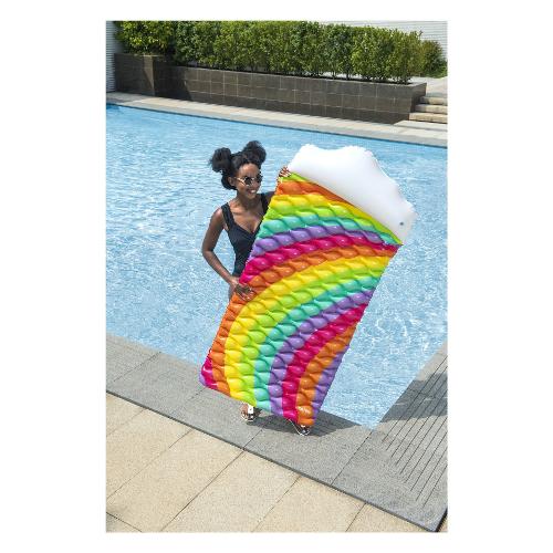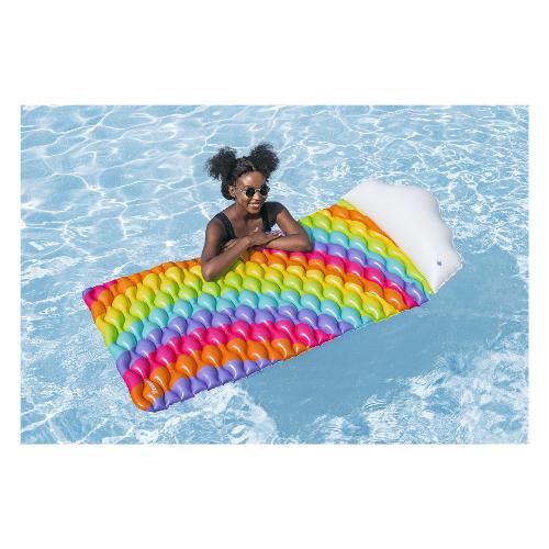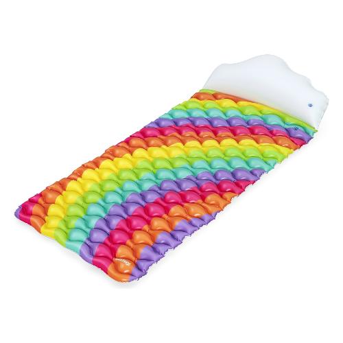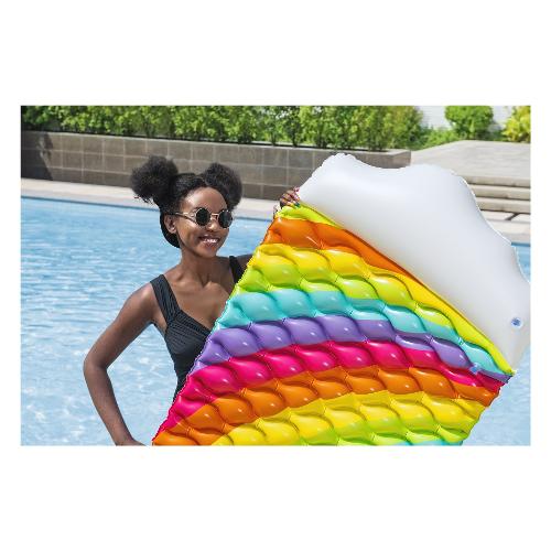 Immergiti nel puro comfort e splendore con il materasso ad aria bestway® rainbow dreams™! Il suo vivace design arcobaleno aggiunge colore al tuo divertimento in acqua, mentre il cuscino a forma di nuvola aggiunge ulteriore comfort. Questo materasso ad aria è anche estremamente pratico: semplicemente arrotolandolo è possibile trasportarlo e riporlo senza sforzo. Nella fornitura è inclusa anche una toppa di riparazione che può essere utilizzata per riparare piccoli danni in pochissimo tempo.