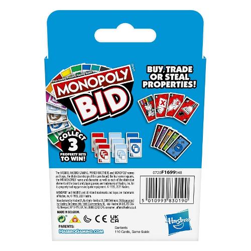 Preparati per un emozionante gioco di carte monopoly super rapido! Monopoly bid è un gioco di possibilità, fortuna e strategia mentre i giocatori partecipano ad aste al buio, pagano con le carte denaro, rubano proprietà con carte azione e cambiano la loro fortuna con le carte tentativo. Si gioca a turno e tutti hanno la possibilità di organizzare un’asta. Quando è il momento di fare un’offerta su una proprietà, i giocatori scelgono quanto denaro mettere a rischio. Poi tutti gridano "1, 2, 3, bid!" E mettono sul tavolo le loro carte denaro. Il giocatore che offre più denaro si aggiudica la proprietà. Colleziona 3 serie di proprietà per vincere. Il gioco monopoly bid è un’ottima scelta per i giochi in famiglia, per le feste e come attività in casa per bambini dai 7 anni in su.