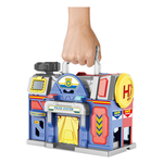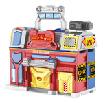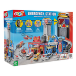 Grande stazione di Emergenza condivisa da Polizia e Pompieri, con luci e suoni realistici, e funzionante a batterie. Dotata di microfono funzionante, due rampe d'accesso, basculanti di entrata ai garage, include due modellini di auto die-cast in scala.