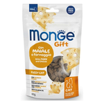 Monge gift gatto appetito difficile con maiale e formaggio è un alimento complementare per gatti adulti. Specificatamente sviluppato per il benessere del tuo gatto grazie all’esterno croccante per il supporto dell’igiene dentale e un morbido ripieno al formaggio per stimolare i palati più difficili. Prodotto formulato senza cereali e con maiale per un’appetibilità e digeribilità ottimale. La formulazione è arricchita con taurina per il supporto alla visione e al normale funzionamento cardiaco e con vitamine per la vitalità quotidiana. L’inclusione di ingredienti funzionali come il lievito di birra per le difese immunitarie e l’olio di salmone fonte di acidi grassi omega-3, è frutto della ricerca made in italy. Senza conservanti artificiali e zuccheri aggiunti.