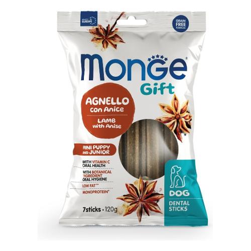 Monge gift puppy and junior mini dog agnello con anice è un alimento complementare per cani cuccioli di taglia mini in accrescimento. Specificatamente sviluppato per il benessere del tuo cucciolo grazie all’inclusione di fibra vegetale per una maggiore elasticità di texture e favorire la masticazione. Prodotto formulato senza cereali e con un’unica fonte proteica animale*, l’agnello, preziosa fonte di proteine ad elevata digeribilità e valore biologico. La formulazione è arricchita con vitamina C per la salute del cavo orale ed è caratterizzata da un ridotto contenuto di grassi** per favorire il mantenimento del peso corporeo ideale durante l’accrescimento. L’inclusione di ingredienti botanici, come l’anice utile al mantenimento dell’igiene orale, è frutto della ricerca Made in Italy per supportare la qualità di vita dei nostri cani. Senza coloranti artificiali e zuccheri aggiunti.