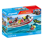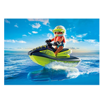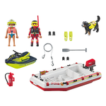 Naviga attraverso emozionanti missioni di salvataggio con il nuovo gommone e acquascooter dei pompieri playmobil! Equipaggiato con attrezzatura subacquea, il pompiere salva il pilota dell'acquascooter in difficoltà, aiutato anche da un cane da salvataggio appositamente addestrato. Il gommone galleggiante è dotato di due sedili con bloccaggio dei piedi, remi e un motore fuoribordo girevole. Un personaggio posizionato sull'acquascooter può galleggiare se messo in acqua. Il cane muove la testa e la coda ed è dotato di un'imbracatura removibile per il giubbotto di salvataggio. Un fantastico playset per emozionanti giochi di ruolo ed eroici salvataggi in acqua nella cameretta dei bambini.
