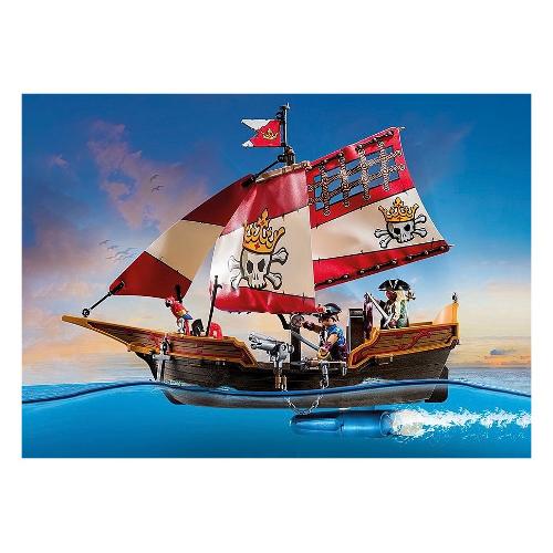 Issate le vele e salpate con la nave dei pirati e la sua ciurma! Emozionanti avventure piratesche attendono tutti i fan dei pirati con la nave pirata di playmobil. Il set dettagliato comprende una nave pirata con vele mobili, cannoni rotanti, due personaggi playmobil, un pappagallo, un'ancora e tanti altri dettagli e accessori. La nave galleggia e può essere potenziata con un motore subacqueo (7350 - venduto separatamente). Cinque morsetti per i piedi sul ponte della nave assicurano che i personaggi stiano in piedi in modo stabile. Con personaggi fantasiosi, attrezzature dettagliate e grandi funzioni, i set di gioco del mondo a tema pirati di playmobil offrono ore di divertimento per bambini dai 4 anni in su.