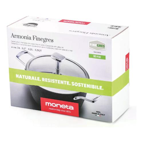 Fornita di un rivestimento in finegres®, innovativo rivestimento 100% naturale, senza pfas, ptfe, pfoa, bisfenolo a, nickel e metalli pesanti, dotato di una formula estremamente antiaderente, di un fondo induction®, di manici ergonomici in acciaio e di un’innovativa finitura esterna “ice coating”, armonia finegres è la nuova linea dall’aspetto moderno in cui l’eleganza delle sue forme si combina con solidità di un prodotto in alluminio di alto spessore con bordi rinforzati.