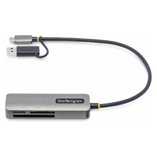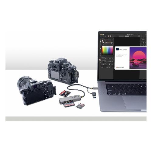Il lettore di schede di memoria USB 3.0 consente di effettuare operazioni di lettura e scrittura simultanee su schede SD, microSD e CompactFlash utilizzando una singola porta USB-C o USB-A.