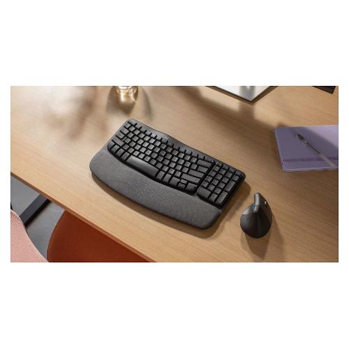 Tastiera ergonomica wireless con supporto per i polsi imbottito, per una digitazione naturale e confortevole per tutto il giorno.