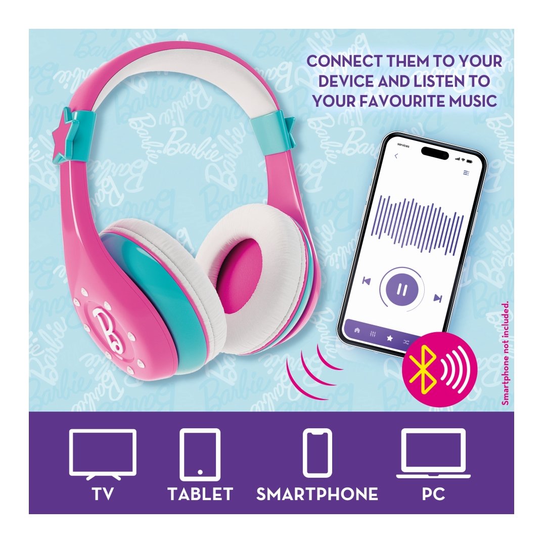 Grazie alla connessione Bluetooth, le cuffie Barbie ti permettono di abbinarle al tuo smartphone e ascoltare le tue playlist preferite. Grazie alle morbide spugne e alla possibilità di regolare la dimensione, sono comodi e adatti a bambini.
