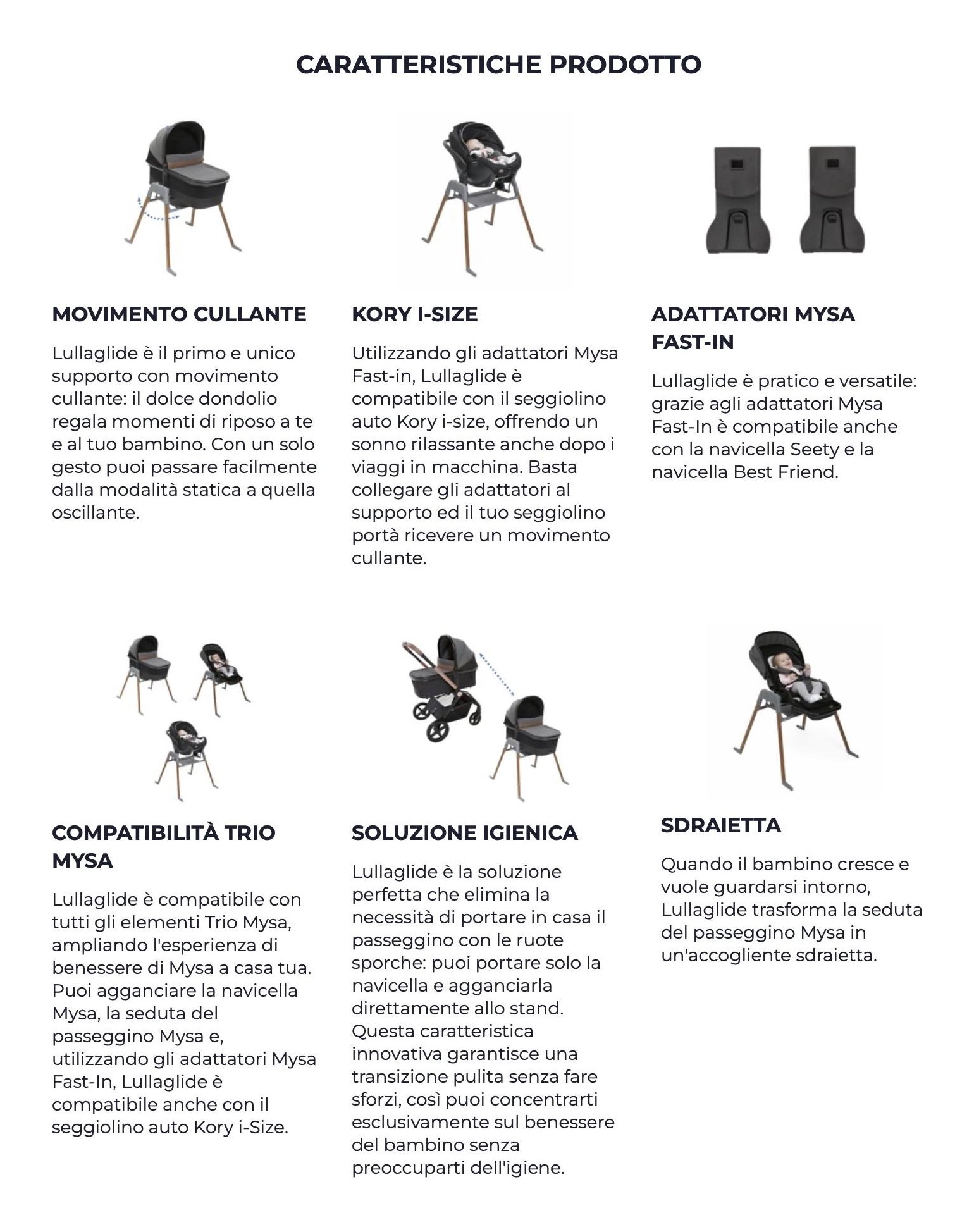 Lullaglide è il perfetto esempio di praticità e versatilità, utilizzando gli adattatori mysa fast-in, è compatibile anche con i sistemi modulari chicco seety e best friend.