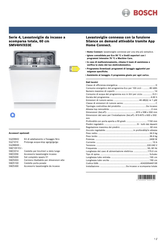 Lavastoviglie incasso 14 coperti SERIE 4 SMV4HVX03E classe D (L60cm)
