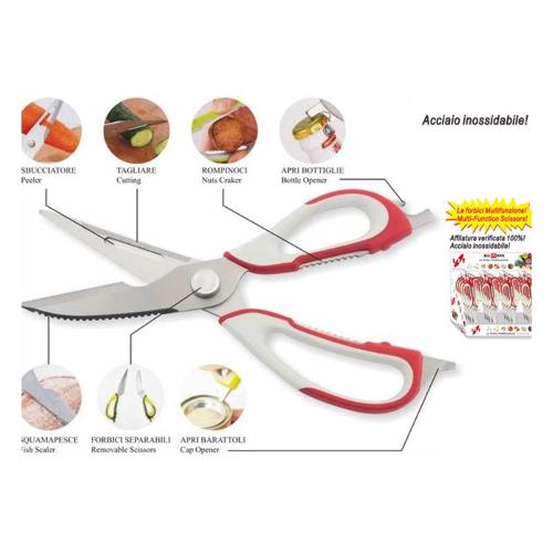 Ideale per sbucciare, tagliare, squamare il pesce, rompere le noci, aprire bottiglie e barattoli. Le forbici sono separabili.