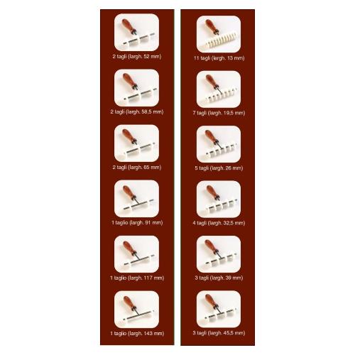 Il tagliafacile è composto da 12 lame facili da regolare in 12 larghezze diverse (mm 13 – 19,5 – 26 – 32,5 – 39 – 45,5 – 52 – 58,5 – 65 – 91 – 117 – 143 mm). E’ adatto a tutti i tipi di pasta, con un solo oggetto potete preparare comodamente tortellini, pappardelle, lasagne, fettuccine, crescentine e paste dolci.