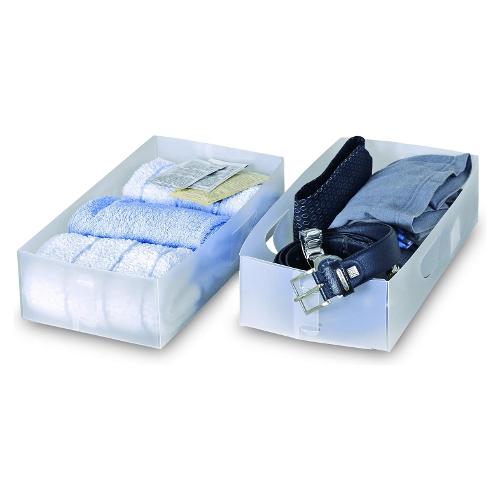 Set di 2 divisori per cassetti in polipropilene trasparente, lavabile e resistente. Ciascun divisore misura 15.5 x 30 x 8 cm cm. Ideali per organizzare i tuoi cassetti e tenere in ordine e a portata di mano la biancheria intima, le calze, le cravatte, le cinture. Sono facilissimi da montare e grazie alle pratiche alette laterali si possono unire tra di loro.