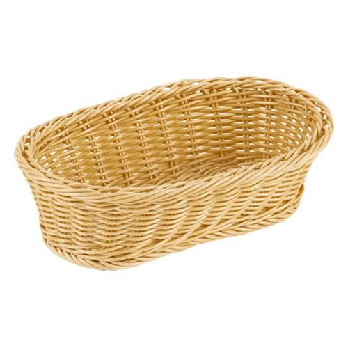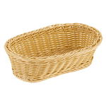 Cestino pane ovale con dimensioni 23x15 cm ed altezza 7 cm, realizzato in rattan sintetico con filo in polipropilene con sezione piena. Il polipropilene è un materiale plastico resistente e flessibile che ne consente un utilizzo intensivo e duraturo, anche grazie al rinforzo con un telaio in acciaio posto sul bordo. É facilmente lavabile anche in lavastoviglie a differenza degli stessi articoli realizzati in rattan più delicati e meno adeguati dal punto di vista igienico.