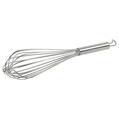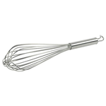 Frusta professionale cucina con 8 fili, realizzata in acciaio inox 18/10. Lunghezza di 35 cm, con anello raccogli fili. Lo spessore del filo di 2,3 mm rende questo strumento particolarmente indicato per la preparazione di impasti duri. Tutte le fruste sono fornite di un pratico gancio per appenderle e hanno il manico resistente alle infiltrazioni di acqua o ai residui di cibo, grazie ad una guaina in resina che ricopre l'innesto dei fili. La frusta professionale cucina si usa per mescolare composti duri, potrebbe venire sostituita dallo sbattitore elettrico o dal frullatore, tuttavia molti cuochi ritengono che il movimento manuale sia indispensabile a garantire la delicatezza di molte preparazioni e che non possa venire rimpiazzato da strumenti elettrici. La sua forma tondeggiante aumenta la superficie di lavorazione e il numero elevato di fili garantisce ottimi risultati.