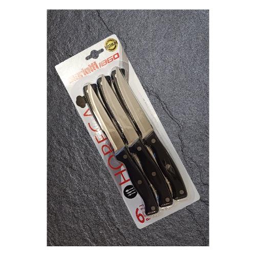 É il tipo di coltello richiesto per tutte le carni rosse e bianche: in particolare bistecche, braciole, costate e tagliate. Lame affilatissime con denti atti a sfibrare le fette senza rovinarle.
