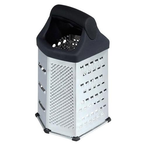 Grattugia universale con 6 facce a torre in acciaio inox e abs con misure 10,5x12 cm ed altezza 20 cm. Dotata di piedini antiscivolo che la rendono immobile sul piano di lavoro, ha una pratica impugnatura in gomma ed è perfetta per grattugiare il parmigiano o per affettare le verdure.