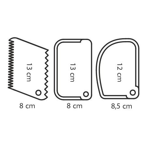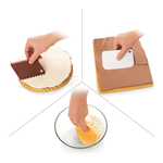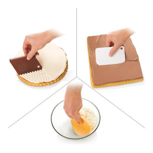 Questo set ti permette di ottenere torte perfette come quelle comprate in pasticceria. Ogni spatola ha una funzione diversa: la gialla flessibile è ideale per raccogliere i più piccoli residui di impasto dalle ciotole, la bianca dura è indicata per livellare perfettamente la panna o le creme sul pan di spagna e quella marrone dentellata per creare simpatici decori.