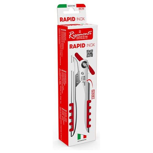Apriscatole Rapid con corpo in acciaio inox e movimento in acciaio temperato. Per aprire lattine e bottiglie con tappo a corona. Grazie al taglio rasente al bordo non rimangono bave nè sulla lattina nè sul coperchio. Manici con impugnatura in plastica.
