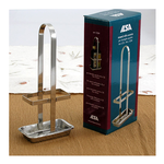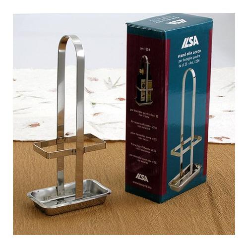 Stand olio e aceto in acciaio inox per bottiglie quadrate da 25 cl. Stand per bottiglie d'olio e di aceto (tipo marasca a sezione quadrata) dotato di una pratica maniglia che ne facilita il trasporto.