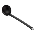 Mestolo in nylon, particolarmente indicato per pentolame con rivestimento antiaderente poiché non ne danneggia la superficie. L'utensile è immune all'attacco degli acidi, non assorbe né odori nè colori degli alimenti. Resistente al calore fino a 210 °c.