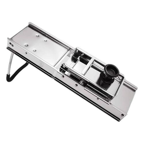 Affetta verdure professionale composto da: base munita di piedini antiscivolo in gomma, una lama liscia e una lama dentata in acciaio flessibile inossidabile, una serie di lame verticali a due larghezze fisse per tagli a bastoncino, un carrello protettore in acciaio inossidabile.