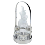 Stand con ampolle per olio, aceto, sale e pepe con diametro di 12 cm. Stand interamente realizzato in acciaio inox dotato di anelli contenitivi per la massima maneggevolezza e sicurezza. La conformazione della base garantisce la totale pulizia del tavolo, mentre le ampolle per l'olio e l'aceto, dotate di beccuccio salvagoccia, permettono di versare con precisione i condimenti.