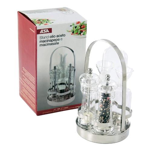 Stand con macinasale, macinapepe ed ampolle per olio e aceto di diametro 13,5 cm. La struttura dello stand è in acciaio inox, le ampolle per olio e aceto in vetro, il macinasale in acrilico con macina in ceramica ed il macinapepe in acrilico con macina in carbon steel.