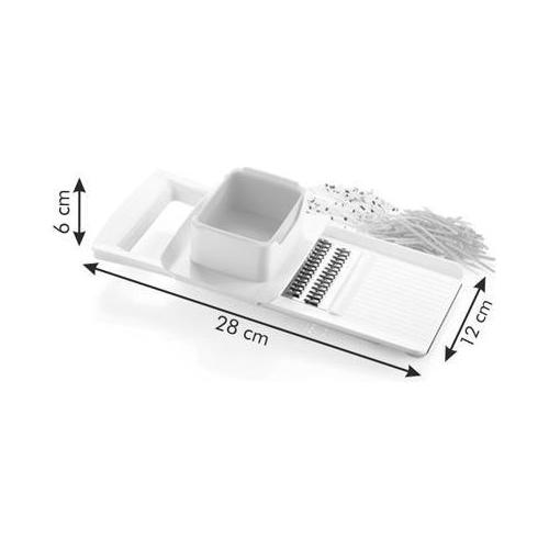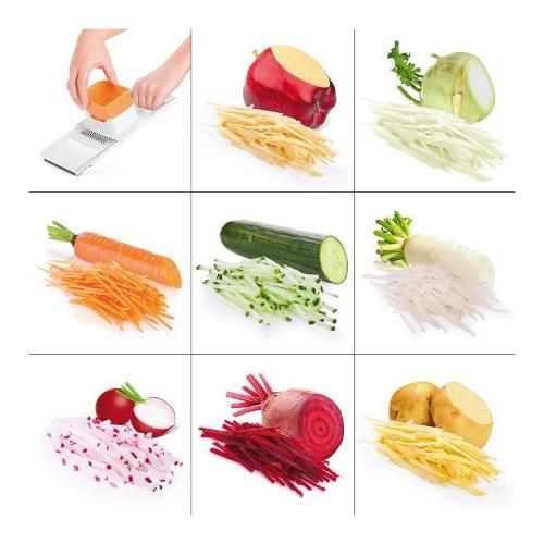 Questa mandolina ti consente di tagliare a julienne ogni tipo di frutta e verdura. È dotata di lame in acciaio inox, fissate verticalmente al centro; per affettare si fa scivolare ripetutamente l’alimento da tagliare, fissato ad un carrello di protezione, sulle lame.
