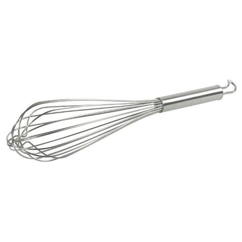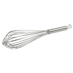 Frusta professionale cucina con 8 fili, realizzata in acciaio inox 18/10. Lunghezza di 45 cm, con anello raccogli fili. Lo spessore del filo di 2,3 mm rende questo strumento particolarmente indicato per la preparazione di impasti duri. Tutte le fruste sono fornite di un pratico gancio per appenderle e hanno il manico resistente alle infiltrazioni di acqua o ai residui di cibo, grazie ad una guaina in resina che ricopre l'innesto dei fili. La frusta professionale cucina si usa per mescolare composti duri, potrebbe venire sostituita dallo sbattitore elettrico o dal frullatore, tuttavia molti cuochi ritengono che il movimento manuale sia indispensabile a garantire la delicatezza di molte preparazioni e che non possa venire rimpiazzato da strumenti elettrici. La sua forma tondeggiante aumenta la superficie di lavorazione e il numero elevato di fili garantisce ottimi risultati.