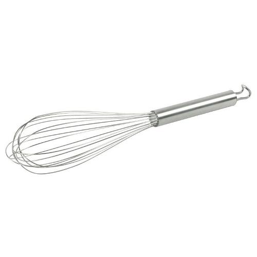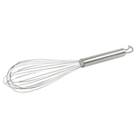 Frusta professionale da pasticceria con 8 fili, realizzata in acciaio inox 18/10 lunga 30 cm. Lo spessore del filo di 1,4 mm rende questo strumento perfetto per la preparazione di impasti morbidi. Tutte le fruste sono fornite di un pratico gancio per appenderle e hanno il manico resistente alle infiltrazioni di acqua o ai residui di cibo, grazie ad una guaina in resina che ricopre l'innesto dei fili. Sono ideali in pasticceria, grazie alla leggera flessibilità dei fili permettono di mescolare, sbattere o amalgamare eliminando i grumi dai composti morbidi (più o meno liquidi) come creme, salse, impasti per dolci o ancora di insufflare aria nei composti per renderli spumosi e leggeri come è richiesto per il pan di spagna, la panna montata o le meringhe. La forma a bulbo aumenta la superficie a contatto con l'impasto.