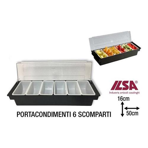 Portacondimenti della linea mixage in abs-pp-pc con misure 50x16 cm e altezza 10 cm. La struttura in abs è completa di coperchio in plastica e bacinelle portacondimenti di facile estrazione. É uno strumento pratico e igienico da utilizzare dietro il bancone di un bar. La linea mixage è pensata appositamente per i professionisti del settore e comprende l’attrezzatura completa per realizzare cocktail.
