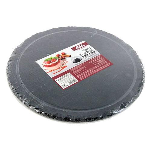 Piano tondo di diametro 33 cm con scanalatura in ardesia naturale, perfetto per un buffet moderno e di tendenza. Caratterizzata dai bordi frastagliati che mettono in evidenza la naturale struttura della pietra, l'ardesia è una particolare varietà di roccia metamorfica allotigena di origine sedimentaria, facilmente divisibili in lastre sottili, piane e leggere. La superficie di ogni piano è trattata con un rivestimento impermeabile, idoneo al contatto con gli alimenti, mentre sulla parte posteriore sono applicati dei piedini antiscivolo che ne garantiscono la stabilità su qualsiasi superficie.