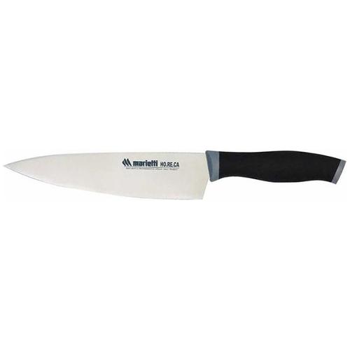 Coltello da cucina con lama in acciaio conico inox 50crmov14 aisi 420 a durezza elevata 54/55 hcr che ne preserva elasticità e flessibilità per usi quotidiani con finitura satinata. Il manico ergonomico é realizzato in doppio stampaggio e rifinito con un termopolimero gommoso antiscivolo e atossico di colore nero e grigio adatto per il lavaggio anche in lavastoviglie.